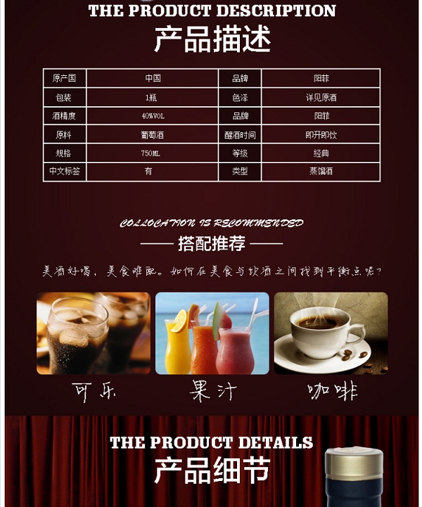 阳菲经典白兰地 酒精度40.0%vol 净含量:750mL商品简介:阳菲经典白兰地,采用独特的酿造工艺,对葡萄原汁进行控温发酵和蒸馏,…